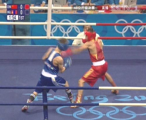 8月24日,男子拳击轻蝇量级(48公斤级)在北京工人体育馆进行,中国选手邹市明战胜蒙古名将普列布道尔吉·塞尔丹巴,为中国收获第50枚金牌。图为邹市明正在进攻。